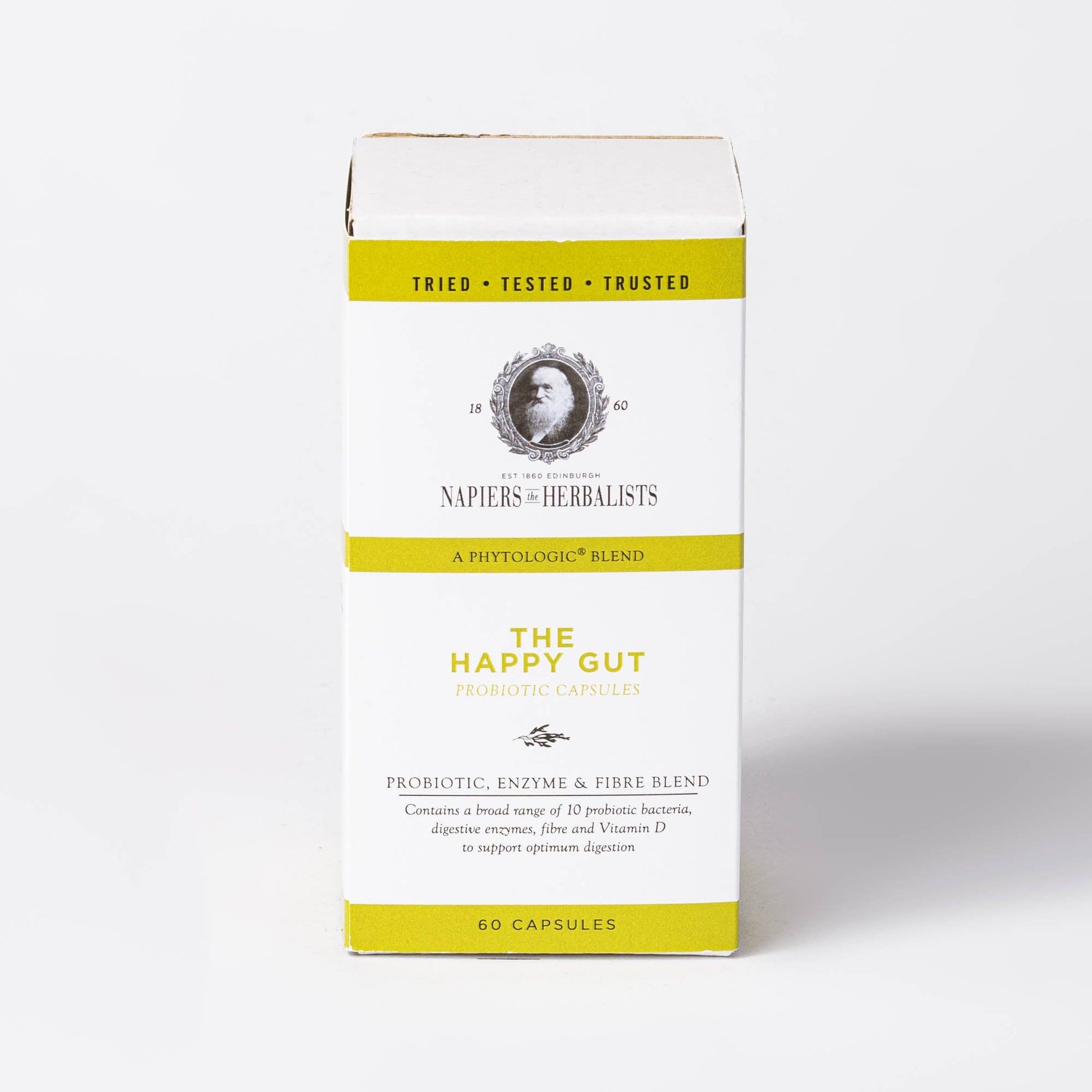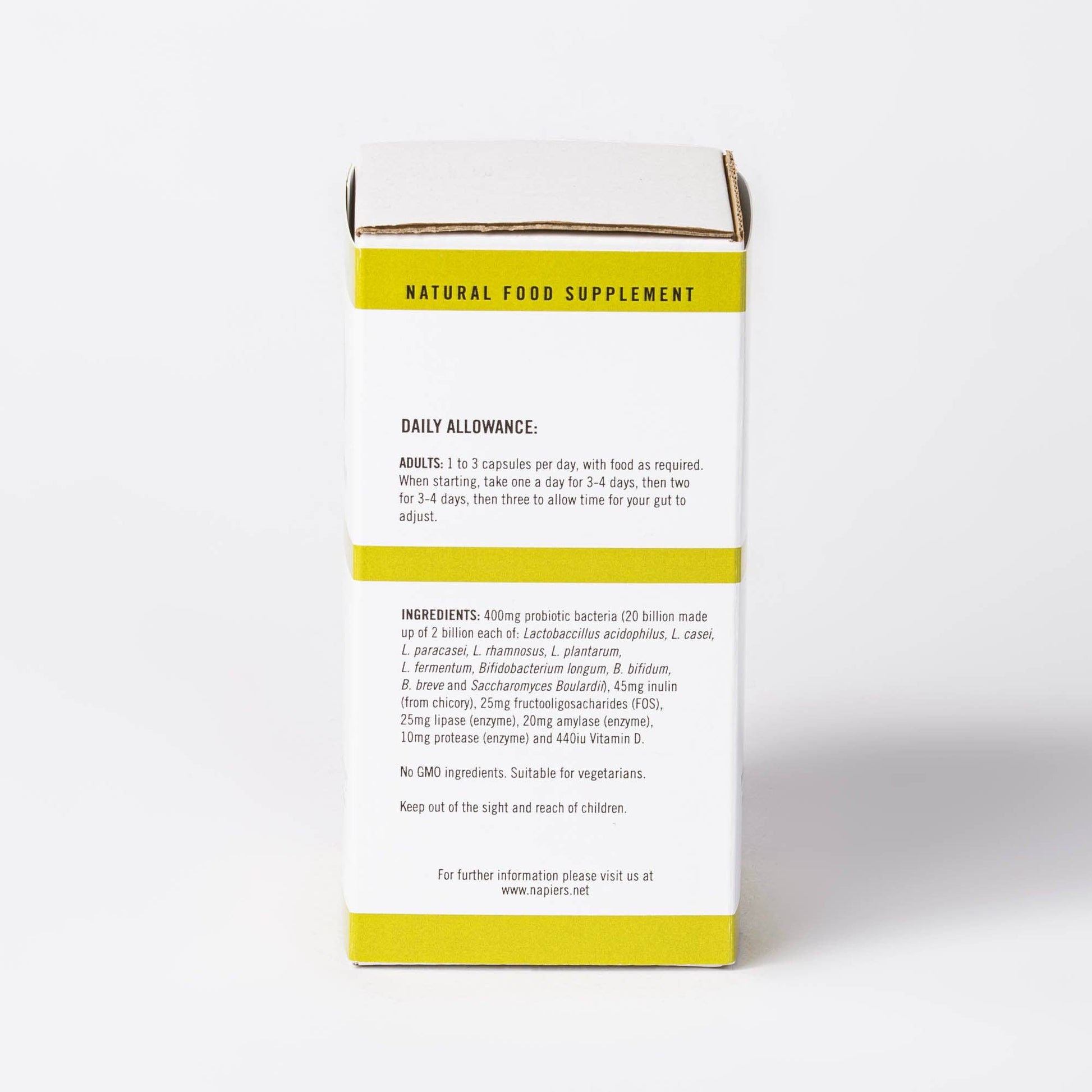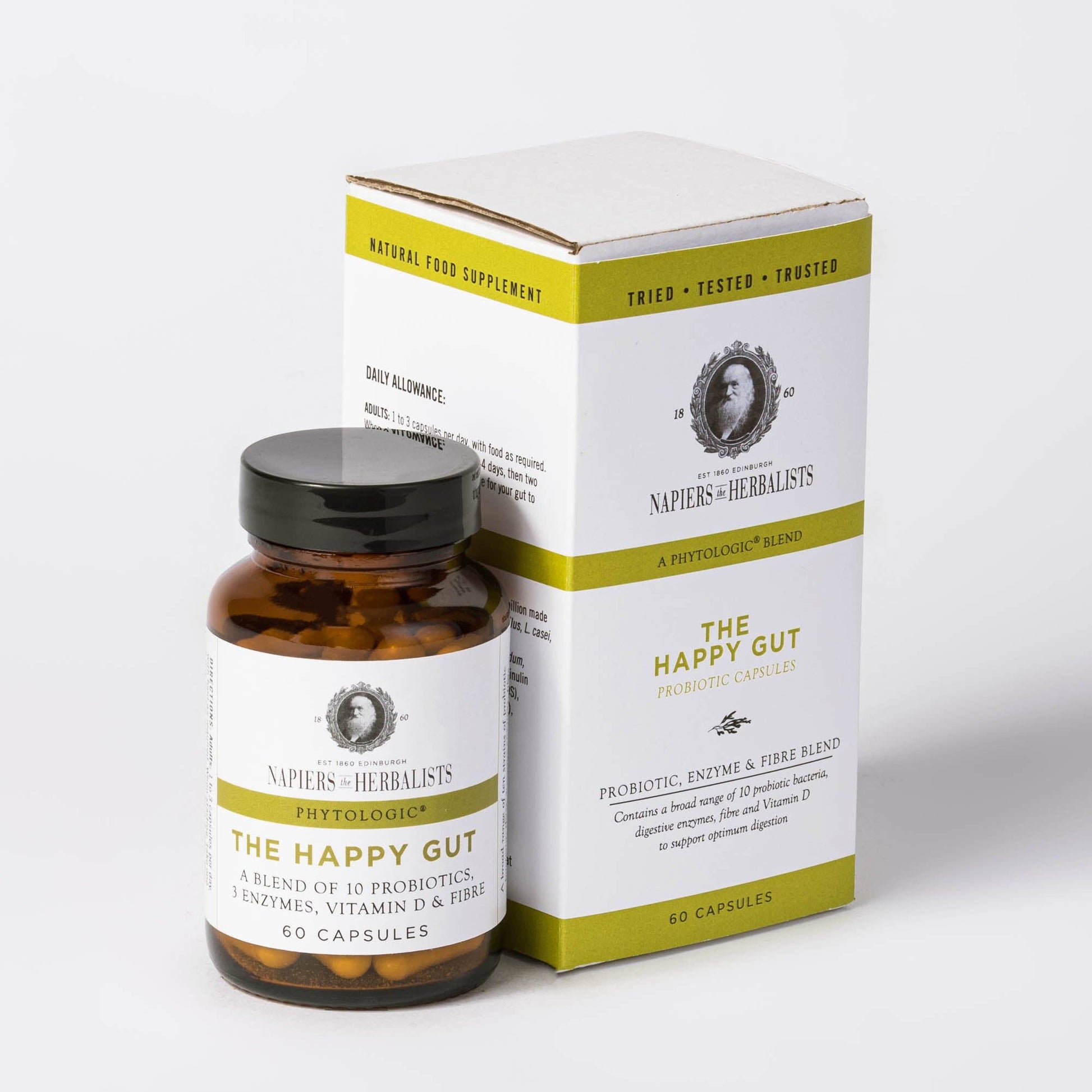 Napiers Happy Gut is a complete blend that, unlike many commercial friendly bacteria supplements, contains not only 10 strains of bacteria but also 3 digestive enzymes, inulin, FOS and vitamin D. This makes it a unique, synergistic, high-performance formula that provides all the building blocks to achieve an optimum microbiome in your gut.
