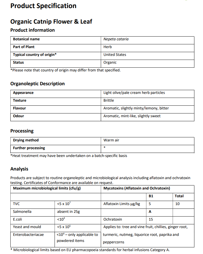 Organic Catnip leaf and flowers Typical Ingredients:
