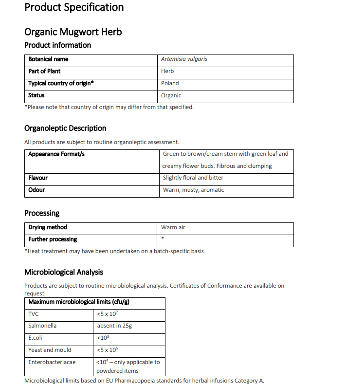 100% pure Botanical, absolutely nothing added, exceptional quality and purity, dried and cut Organic Mugwort herb (Artemisia vulgaris)