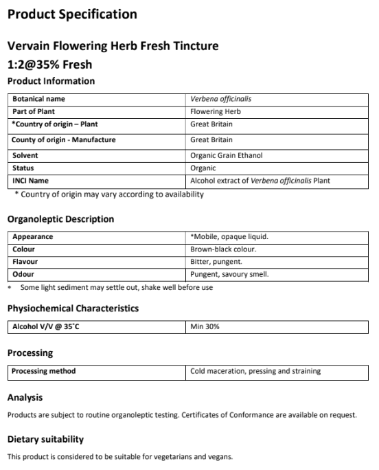 Organic Vervain Tincture, fresh flowering herb, 1:2 35%
